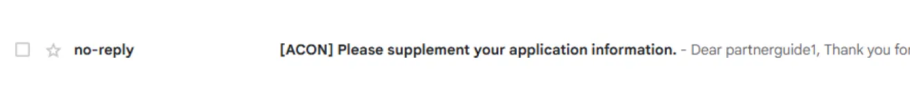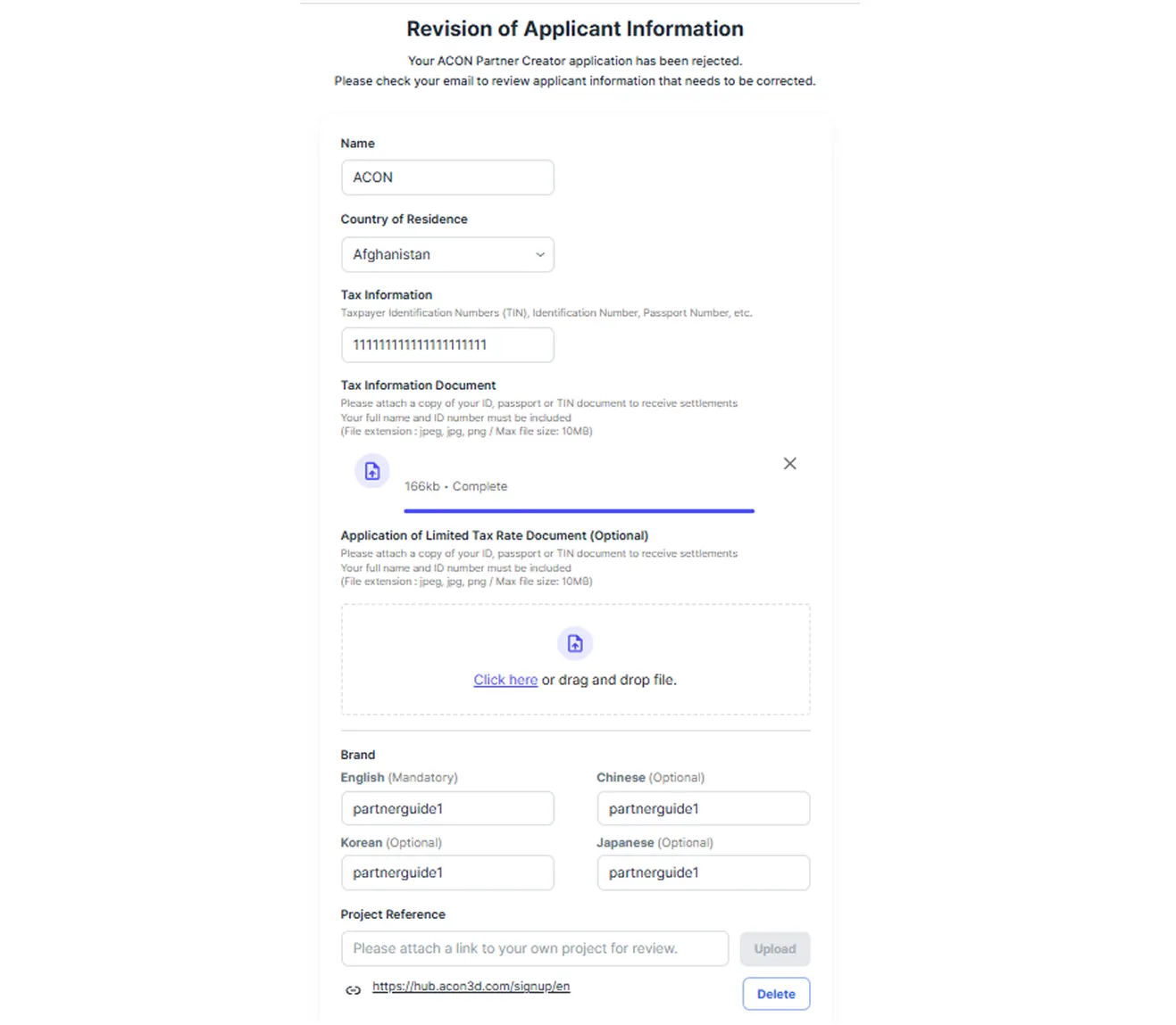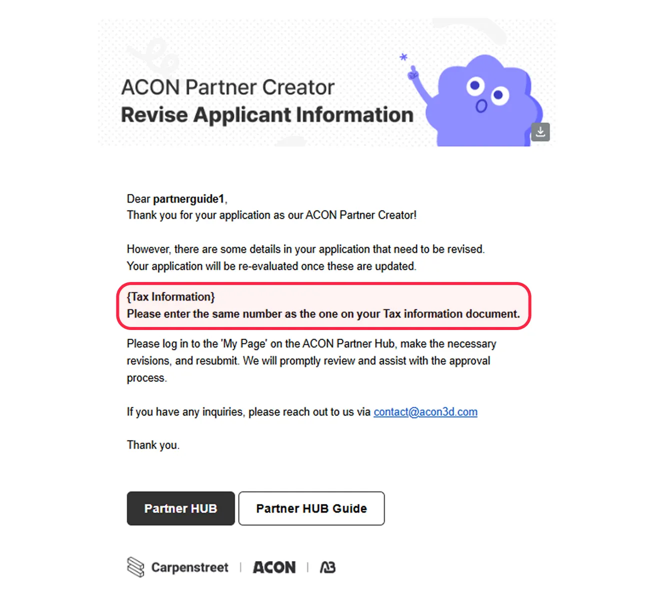 Please check the reason for rejection in the “ACON Partner Creator Revise Applicant Information” included in the email.