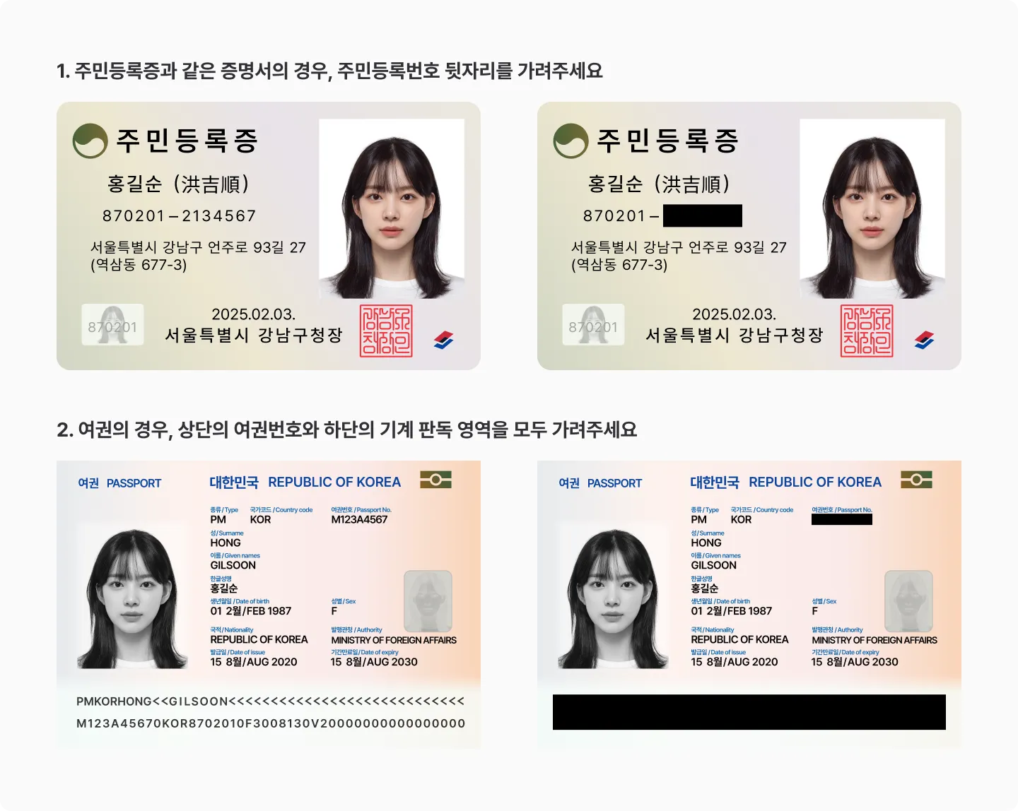 주민등록번호(외국인등록번호) 뒷자리 , 여권 번호는 가려야 합니다.