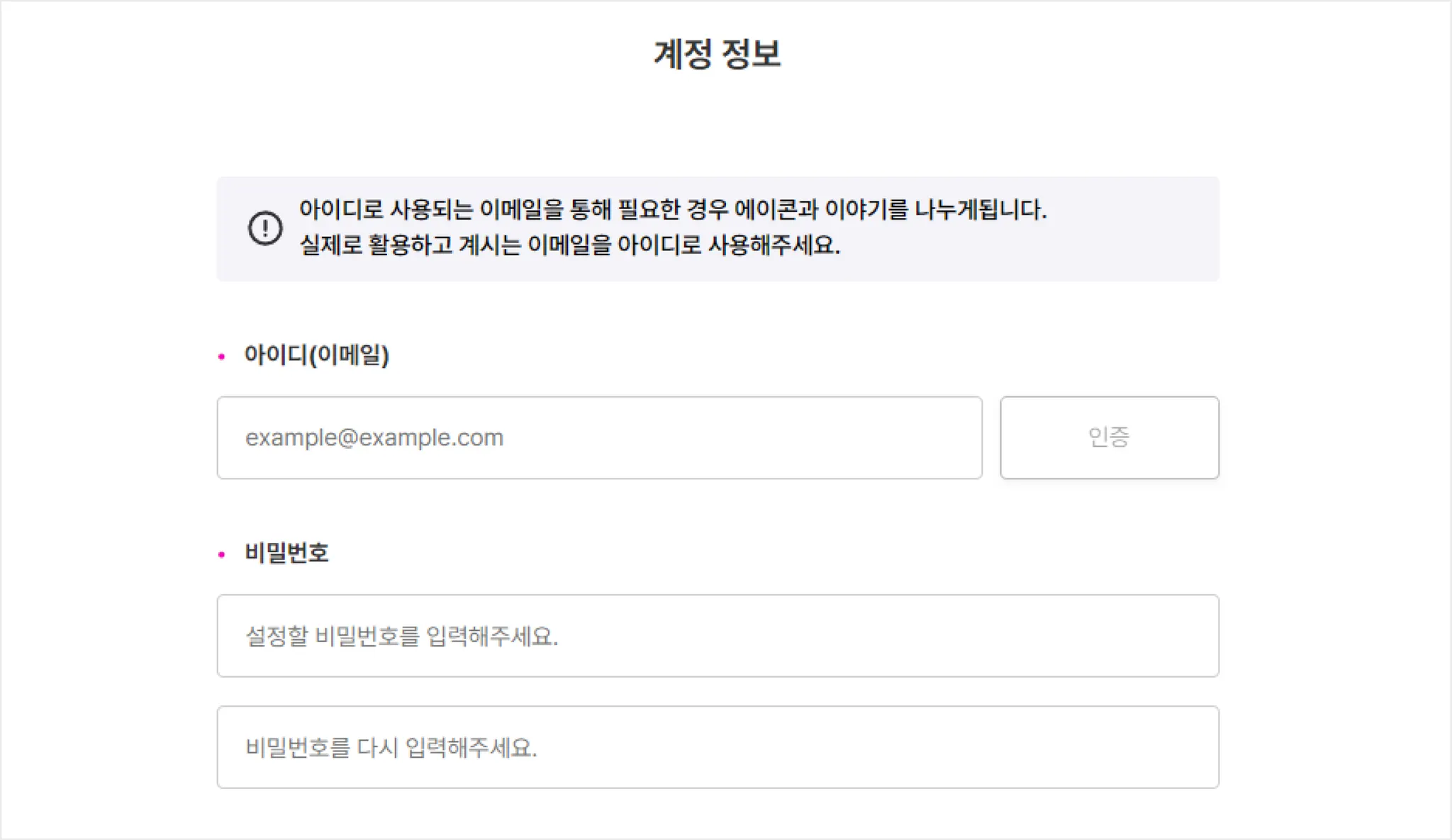 아이디(이메일)로 에이콘에서 발송되는 모든 메일이 전송되니 수시로 메일함 확인이 가능한 이메일 주소를 아이디로 설정해주세요.