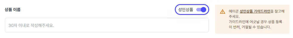 속성 활성화 시 나타나는 우측 가이드 라인을 참고해서 성인 상품을 등록하실 수 있습니다.