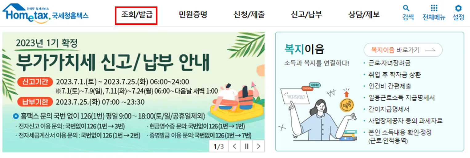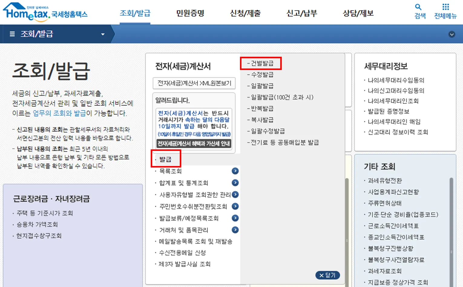 아래의 전자(세금)계산서 메뉴에서 발급 → 건별발급을 누릅니다.