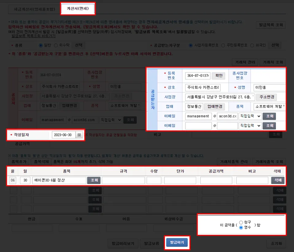 아래와 같이 세금계산서 내용을 기입해주세요.